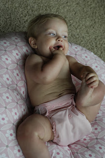 • Diapers (duh, right?) - you can have as few or as many as you want.  I started with just two cloth diapers, alternating between disposable and cloth for months, while I slowly built up my stash.  If you have any older baby (a few months or more) and want to cloth diaper full-time, you'll need about 18 diapers, at least (I prefer having more so I can go two days between laundry if I want to).